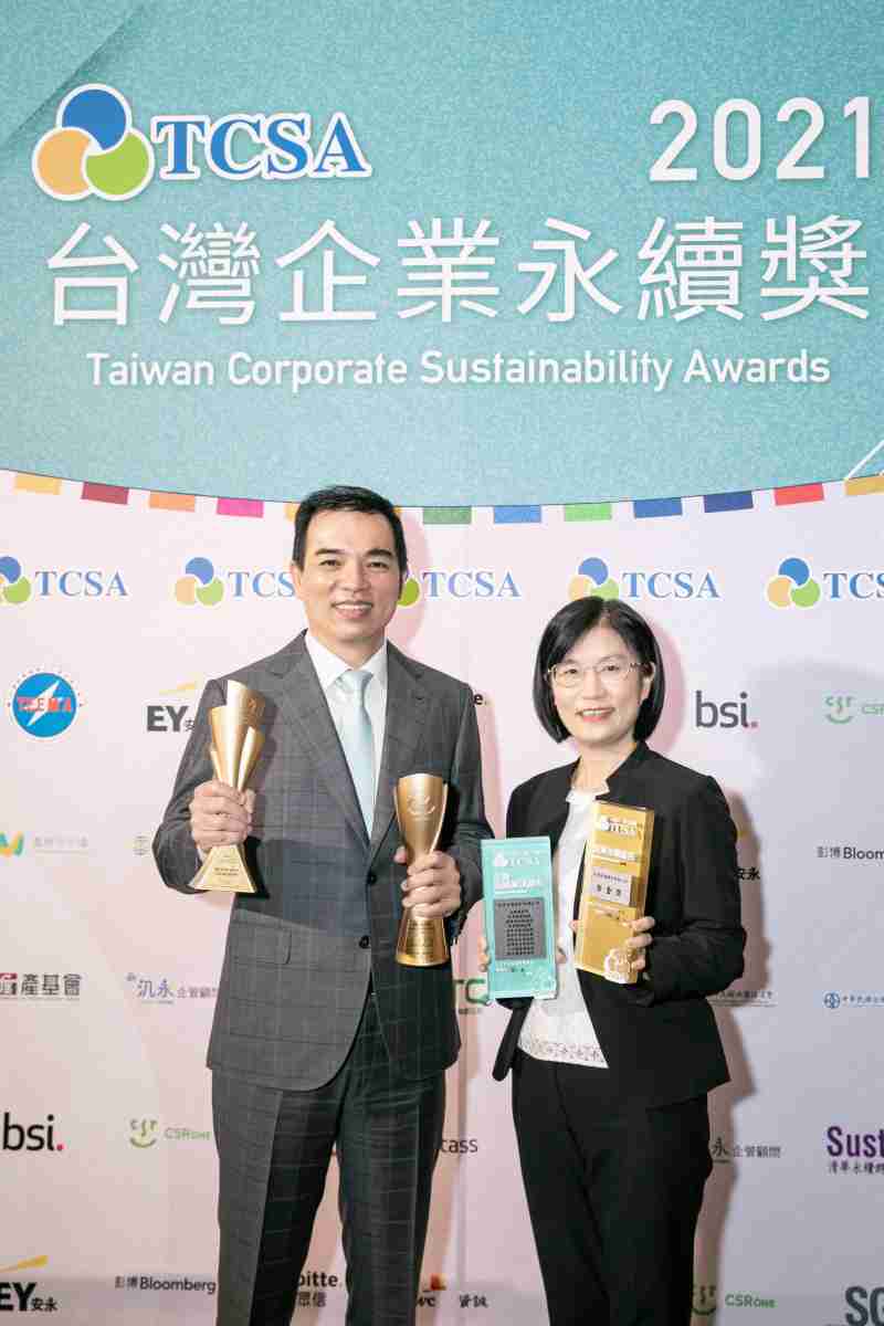 达在台湾永续奖所评比环境、、社会、、、、治理等各面向的永续绩效均获高度肯定 (左:人生就是博光电总经理暨营运长柯富仁,,,,右:人生就是博光电永续长古秀华)